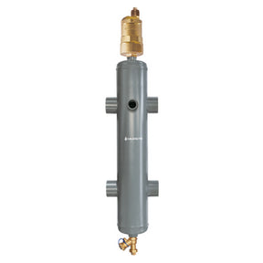 In addition to isolating the primary circuit from the secondary circuit, the new 4 in 1 hydraulic separators from Calefactio separates water, air, dirt and ferrous debris. The coalescence process produced by the media allows air and micro-bubbles to fuse and then be evacuated through the automatic air vent.